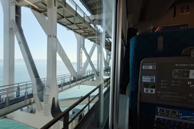 阿波池田駅から乗車した快速藍よしのがわトロッコ号は、徳島線を吉野川に沿って進みます。今日は空いていてトロッコ車両にも空きボックスがあります。やはりこの時期の夕方のトロッコ列車の乗車は厳しく阿波池田を出た時点で寒さとの戦いとなります。何組かの家族連れは阿波池田駅発車後早々に185系(控車)に移動してしまいました。列車は、佃駅から徳島線に入り辻駅を過ぎると吉野川が見えてきます。ここで痛恨のミスが・・・。私はトロッコの進行方向窓側とキハ185系の窓割の良い席選びに考えが傾き車窓の調査をしなかった・・・。つまり私の席は山側で通路を挟んだ反対が吉野川が見える方でした。この原則は最後まで変わりません。ただ、幸いなことに今日は空いているので川が見える区間は空いている席に席を替わっても大丈夫とのことで有り難く川が見える区間だけ席を移りました。吉野川沿いに進んだ列車は阿波加茂手前で吉野川と別れて田園地帯を走行します。その後、江口付近で再び吉野川に沿って進みます。トロッコ車内限定で観光ガイドの方が詳しく車窓の解説をしてくれるので飽きることはありません。