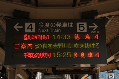 指定席券はe5489で予約しました。座席表で座席が選べるのでトロッコ列車は進行方向側でキハ185系に移ったときは窓割の良い席を選びました。が、こればかりに気を取られていて肝心な吉野川の車窓とは反対側の席を選択してしまいました。これは私の失態で痛い経験となりました。救いだったのは、この日は空いていて吉野川が見える方の空いている座席に移っても良いとのことで吉野川の車窓は何とか楽しめました。