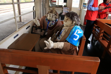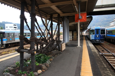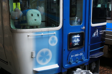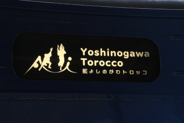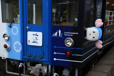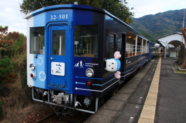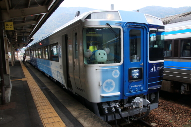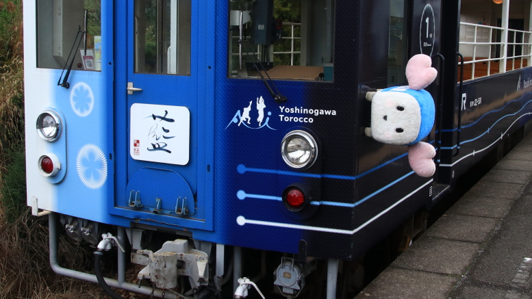 | 藍よしのがわトロッコ号は順調に進み貞光駅に停車します。貞光駅で少々停車したのでホームへ降りて休憩します。後部のトロッコ車両の運転台横にはマスコットの「れっちゃくん」がくっついていて面白かったです。これは停車時間のみの演出で発車時刻前にはキハ185系に戻されています。こんな遊び心も嬉しいです。 |