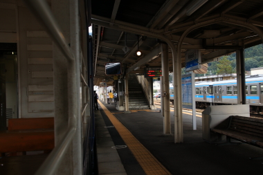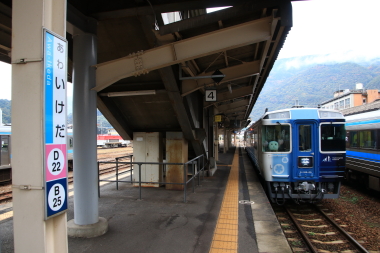| 阿波池田駅から快速藍よしのがわトロッコ号に乗車します。列車は早めに入線してきたのでいろいろ撮影ができました。まだ車内にも乗客は乗っていませんのでキハ185とキクハ32両方の車内を撮影しておきました。全体的に吉野川をイメージしたい落ち着いた塗装が私好みで好感が持てます。時間があるのでいろいろ撮影はしましたが、2両編成で隣には特急剣山号が停車しているので撮影も早々に終り控車のキハ185系の指定された席番に荷物を置いてトロッコ車両に移動して発車まで待ちます。 |