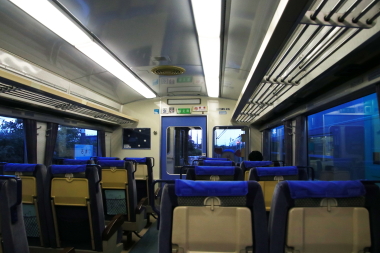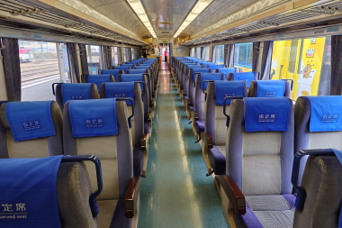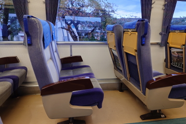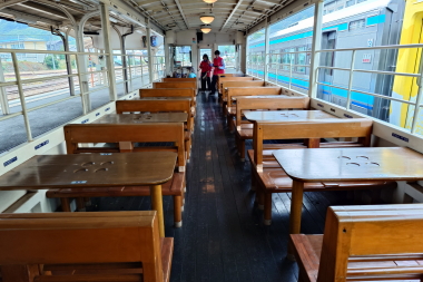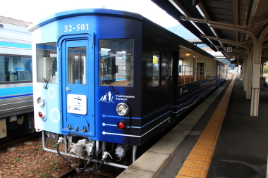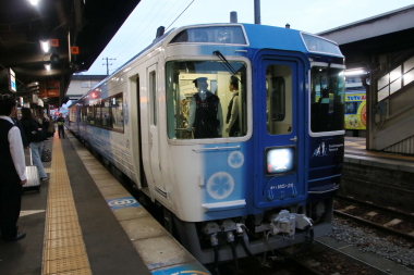 | ただ、駅構内に入場したのが早くまだ車内にも乗客は乗っていませんのでキハ185とキクハ32両方の車内を撮影しておきました。キハ185の方は今では懐かしさを感じる昭和末期から平成初期のリクライニングシートが並んでいます。枕カバーには「指定席」の文字が入っています。トロッコの方は何処の地方でも見られる一般的なトロッコ列車変わらないスタイルです。ただ、編成端のボックス席には人形が乗っているため指定席としての発売は行なわれていません。 |