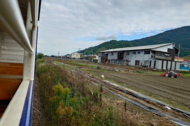 阿波池田駅から徳島へ先行する特急剣山6号に続いて阿波池田駅を発車した快速藍よしのがわトロッコ号は徳島駅を目指して進みます。ただ季節は11月でこの時間帯でも結構寒いです。いきなり寒さとの戦いの洗礼を受けます。車内では観光協会の方が観光案内放送をしてくれています。列車は土讃線を進み佃駅から徳島線に入ります。この時点で早々に控車に移動する人(家族)が何組か・・・。子供連れでは仕方ないですね。列車は、辻駅を過ぎると吉野川が見えてきます。ここで痛恨のミスが・・・。私はトロッコの進行方向窓側とキハ185系の窓割の良い席選びに考えが傾き車窓の調査をしなかった・・・。つまり私の席は山側で通路を挟んだ反対が吉野川が見える方でした。この原則は最後まで変わりません。ただ、幸いなことに今日は空いているので川が見える区間は空いている席に席を替わっても大丈夫とのことで有り難く川が見える区間だけ席を移りました。吉野川沿いに進んだ列車は阿波加茂手前で吉野川と別れて田園地帯を走行します。天候も少しは回復してきましたがまだまだ寒いです。その後、列車は江口付近で再び吉野川に沿って進みます。トロッコ車内限定で観光ガイドの方が詳しく車窓の解説をしてくれるので飽きることはありません。