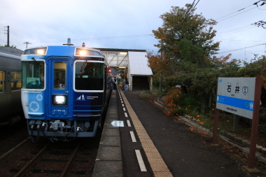 列車は田園地帯と住宅地を進むうちに徐々に暗くなりいよいよ寒さも限界と言うところで石井駅に到着します。トロッコ車両の乗車は石井駅までです。よく寒さに耐え抜いた。
