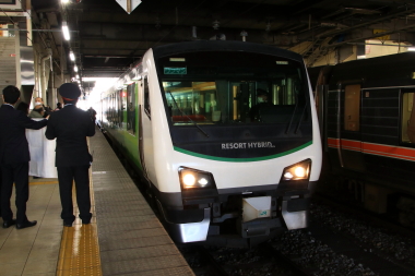長野駅では長野駅社員の方々による横断幕による見送りがありました。列車自体は発車の10分ぐらい前に入線してきますが、横断幕での見送りがあると撮影に時間が掛かり発車直前にようやく乗車した感じになります。ちなみに行先表示は「リゾートビューふるさと」になっています。個人的には「臨時」表示も期待してみましたが・・・。