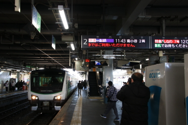 快速南小谷駅開業90周年号は、放送が一新された松本駅に到着します。「まつもとー」の語尾の伸びがが継続されたのは何よりです。松本では、大糸線へ入るため列車の進行方向が変わります。このため座席転換を行ないます。座席の転換を行なうと昼食を買いに2階のコンコースへ向かいます。幸い空いていたのですぐに昼食弁当を購入してホームへ戻り撮影。長野駅に続いて松本駅も手の込んだ発車案内が表示されています。「臨時快速」だけの味気ない表示からかなり長野支社も進歩しました。
