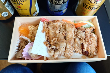 穂高から再び南小谷駅開業90周年号の旅を再開します。時間はお昼時から30分ほど過ぎましたが、穂高駅発車後に昼食となります。昼食は、松本駅停車時間中に購入した「山賊焼」弁当です。松本・塩尻へ来るとこの弁当ばかり購入しているような気がします。ビールか片手に山賊焼きを楽しみながら列車は進みます。反対側の車窓には美しい北アルプスの山々が見えます。列車は高瀬川を渡ると信濃大町に到着します。