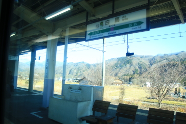 信濃大町を出ると安曇野に別れを告げて住宅地を進みます。住宅地が途切れて山間部に入ると仁科三湖っが見えてきます。とは言え私の座席とは反対側の車窓ですのであまり良くは見えませんが・・・。まずは、木崎湖斑を通過します。この湖畔を通過中に稲尾駅と海ノ口駅を通過します。私が座っている側の車窓は国道と山のみです。それでも海ノ口駅舎が見えたのは良かった・・・。しばらく山間部を進み中綱湖が見えてきて続いて青木湖が見えてきます。青木湖を過ぎると山間部を進みます。神城駅を過ぎると開けた車窓に変わり住宅地が増えて平良川を渡りオリンピック施設が見えてくると白馬に到着します。