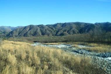 姨捨を出ると列車は冠着を経て聖高原を通過します。反対側の車窓には北アルプスが僅かに見えます。列車は坂北を経て西条を過ぎると長いトンネル(白坂トンネル)3本を立て続けに通過します。長いトンネルを抜けると反対側の車窓には北アルプスの山々が見えてきます。今日は反対側の座席ですのでよく見えないのが残念ですが・・・。 しばらく反対側の車窓では北アルプスの山々と梓川と奈良井川が合流して犀川となる合流地点など見所が続きます。私の席は山ばかりですが・・・。列車は、田沢駅を通過してこれから走る大糸線が平行すると松本に到着します。