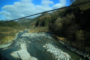 リゾートビューふるさと号だと白馬駅でほとんどの方が降りてしまうようですが本日は数名下車しただけです。 白馬駅からは小谷村観光協会の方々が乗ってきて記念品配布と観光案内をしてくれます。こちらのサービスは本日限定です。白馬駅をほぼ満席で発車した南小谷駅開業90周年は南小谷を目指してラストスパートです。松川を渡りしばらくすると信濃森上に少々運転停車します。信濃森上の有名撮影地は誰も居ませんでした。姫川第2ダムを渡るとしばらく姫川に沿って進みます。白馬大池を過ぎてしばらくすると姫川を渡りようやく私が座っている側の車窓に姫川が見え始めました。千国駅を過ぎて姫川を再度渡ると新しくできたバイパス道路が見えてきて終点の南小谷に到着します。