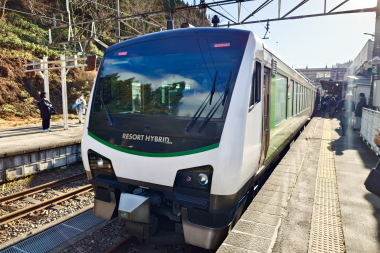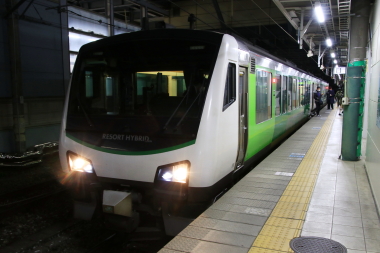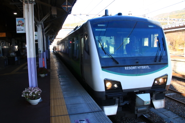 長野駅から快速南小谷駅開業90周年号に乗車します。、列車入線時の自動放送は「快速・南小谷行」のみで特に列車名の案内はありません。本日使用されるのは、HB-E300系です。簡単に言うと快速リゾートビューふるさと号と特に変わりはありません。列車名が「南小谷駅開業90周年」となっているだけです。それでも昨今の情勢を考えると快速リゾートビューふるさと号(南小谷駅開業90周年)でも十分記念と列車として成り立つかと思いましたが、しっかりと「南小谷駅開業90周年」と列車名が付けられたのは良かったです。