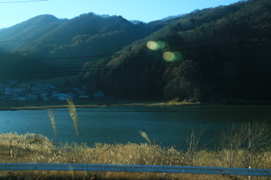地元小学生に見送られて快速南小谷駅開業90周年号は南小谷駅を発車します。帰りとなるこの列車は、アルプス側の席が確保できました。こちらの列車も1号車はほぼ満席となっています。南小谷を出ると小谷村観光協会の方々が記念品配りつつ白馬まで観光案内をしてくれます。なお、長野行も南小谷行と同じく車掌が乗務します。自動放送も行なわれず行先表示は非表示でした。列車の方は姫川に沿って進み何回か渡ります。最後に姫川第2ダムを渡ると姫川とはお別れです。車窓には北アルプスの山々が見えてはきますが、晩秋の夕暮れは早く結構西日となっています。要するに逆光でよく見えません。列車は信濃森上を出て松川を渡り白馬に到着します。