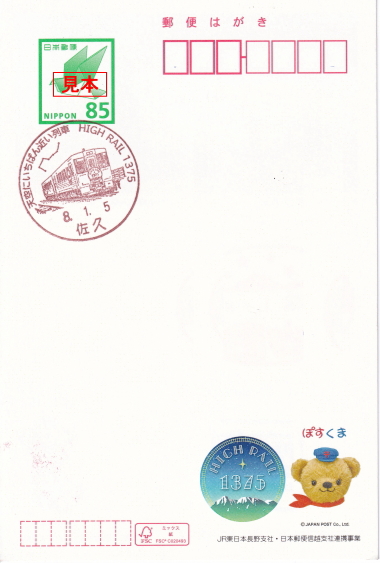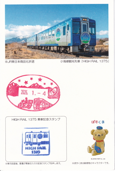 また、野辺山-中込間を乗車すると、物販カウンターでオリジナル葉書を無料で貰う事ができます。こちらは、日本郵便の手紙文化振興政策の一環で葉書には「ぽすくま」が印字されています。こちらは、2025年11月29日から2026年3月29日までの期間で先着1000枚配布されます。欲しい方は早めに快速HIGH