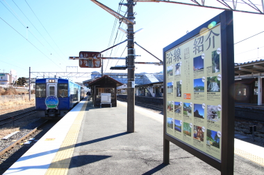 駅弁を購入して再び改札を入り小海線ホームの5番線へ、すでに中込駅から快速HIGH RAIL号は回送されて到着はしていますが、すぐにはドアは開きません。撮影には好都合なのですが、撮影とは言え5分もあれば終ります。今日は見事なまでの冬晴れで、その分気温も低くホームで待つのも結構しんどいです。ドアは発車の10分前ぐらいに開くとのこと。 |