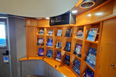 RAILへ行ってみます。星や星座の本が図書館のように並んでいます。ただ、私が興味を示す本は無かった・・・。列車内なので少しは鉄道関係の本も置いて欲しいところです。列車は林の中の上り勾配を進みます。そろそろ白竜の滝が見えると放送が入るので自席へ戻ります。 |