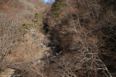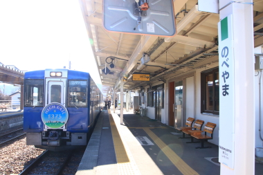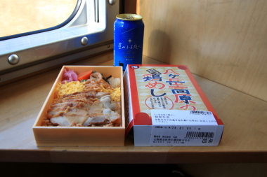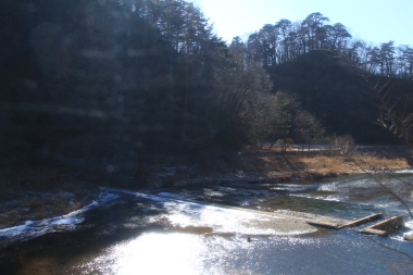 | 野辺山を出た列車は高原野菜の産地を進みます。夏場なら高原野菜であるレタス畑が続いて一面緑の絨毯となるのですが、今の時期は何も栽培されていないので明るい茶色の土が車窓一面に広がります。信濃川上を出ると山間部に入ります。ここで小淵沢で購入した駅弁で昼食とします。今回は、「八ヶ岳高原の鶏めし」を選択しました。こちらは炊き込みご飯の上に信州味噌を使用した鳥の照り焼きが載っています。駅弁全般に言えるのですが最近は値上げで駅弁も贅沢品になりました。今回は、駅弁の他に1号車のカウンターで銀河ビールを購入して優雅な昼食の一時を過ごします。車窓の方は冬枯れした山間部に入りますので車窓的にはイマイチなのですが千曲川が見え始めます。まだ源流に近い方ですので川幅は大して広くはありません。何回か千曲川を渡ると川幅がだんだんと広くなっていくのが解ります。列車は小海を過ぎても山間部を進み北上を続けます。 |