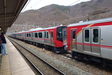 上田駅での停車では、ようやくS1編成側の先頭が撮影できました。戸倉駅ではホーム一杯に止まるのであまりよく撮影はできませんでした。さぞかし混むだろうと思いましたがあっさりと撮影できました。反対にS9編成側は混んでいて撮影も苦労しました。車内の様子からも、私が乗車しているS1編成よりS9編成の方が明らかに混んでいて、やはり山スカ色のS9編成はに人気があるのだろうと・・・。