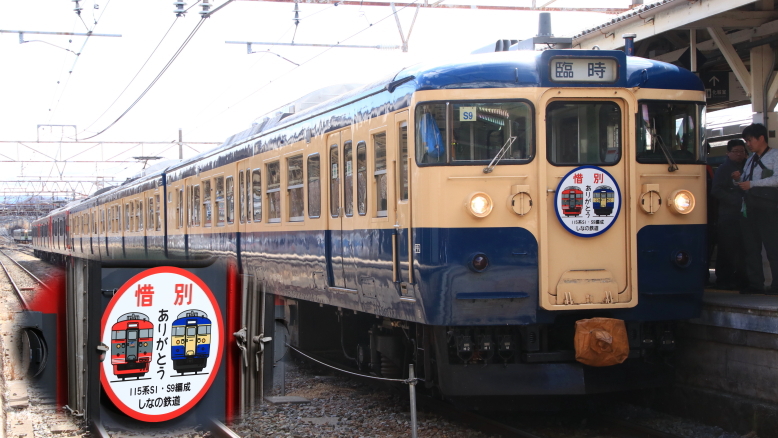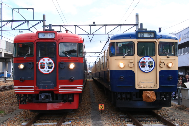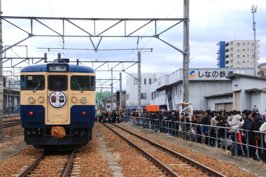 3月のダイヤ改正で引退(廃車)が発表されている115系S1編成・S9編成の引退記念号が、戸倉→小諸・小諸→上田で運転されました。上田駅到着後は、しなの鉄道本社脇の留置線にて撮影会などのイベントが行なわれました。