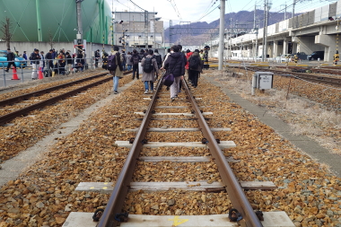 撮影後は、なんと線路(留置線)を歩いて踏切に出て終了と完全一方通行となりました。撮影会もそうですが、現役の留置線を歩けるのも貴重な体験でした。