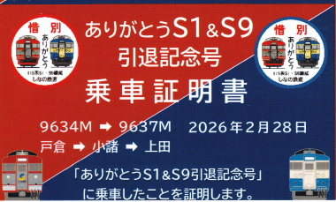 今回の「ありがとうS1&S9編成引退記念号」では、上り(往路のみ)乗車記念証が配布されました。配布区間は、上田−小諸で配布されました。乗車率が高かったのですが、配布は特にトラブルも無く順調に進みました。下りは、各駅に停車する普通列車で運転されるためか配布は行なわれませんでした。